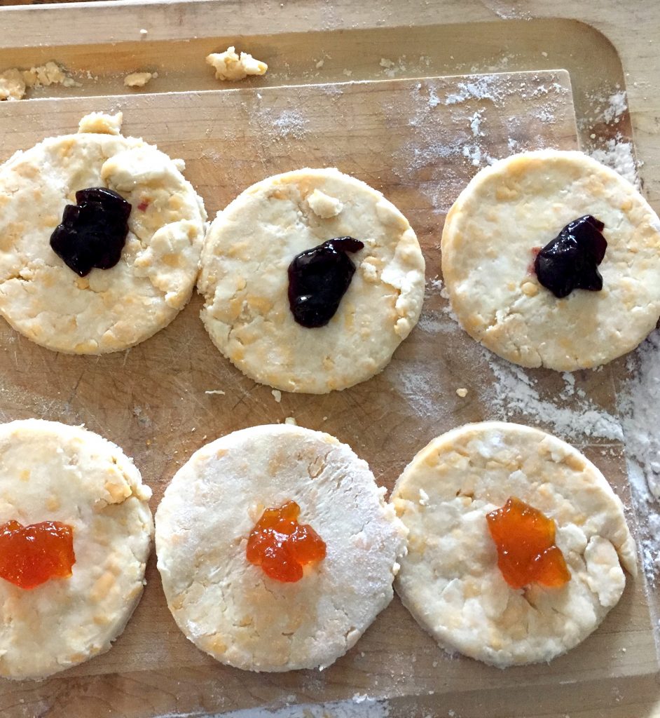 Every morning, Hannah, the March family’s Irish cook, bakes hot turnovers for the sisters to help them keep their hands warm on the way to work and school. Here, then, are Hannah’s Turnovers (before being turned over and baked, of course!). Savory cheese-butter crust with a dot of sweet jam filling. Oh my.