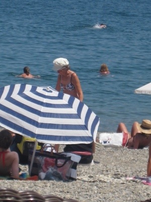 I truly have seen women of all ages and sizes wearing bikinis on the beach. They all seem “bien dans leurs peaux”-comfortable in their own skin. By way of example, this woman looks fantastic—who cares if she has gray hair, she’s lovely.