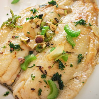 Trout Meunière with Celery, Pistachios, and Garlic Cloves