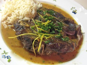 Poulet Bijoutière (the jeweler’s chicken-braised with garlic, wine, pomegranate juice and a touch of currant jelly)