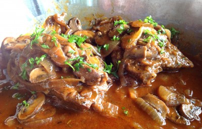 Well, yes. It was often that way. As Stevens points out, traditional recipes called for top round steaks, “a cut that becomes dry and leathery when braised…” And if you grew up in the 70s (as did I), you might have had an even worse version of this dish: minute steaks smothered in canned cream of mushroom soup. Later, in college, I used to feed it to my roommates. It did the trick, but I doubt I’d ever want to revisit that.