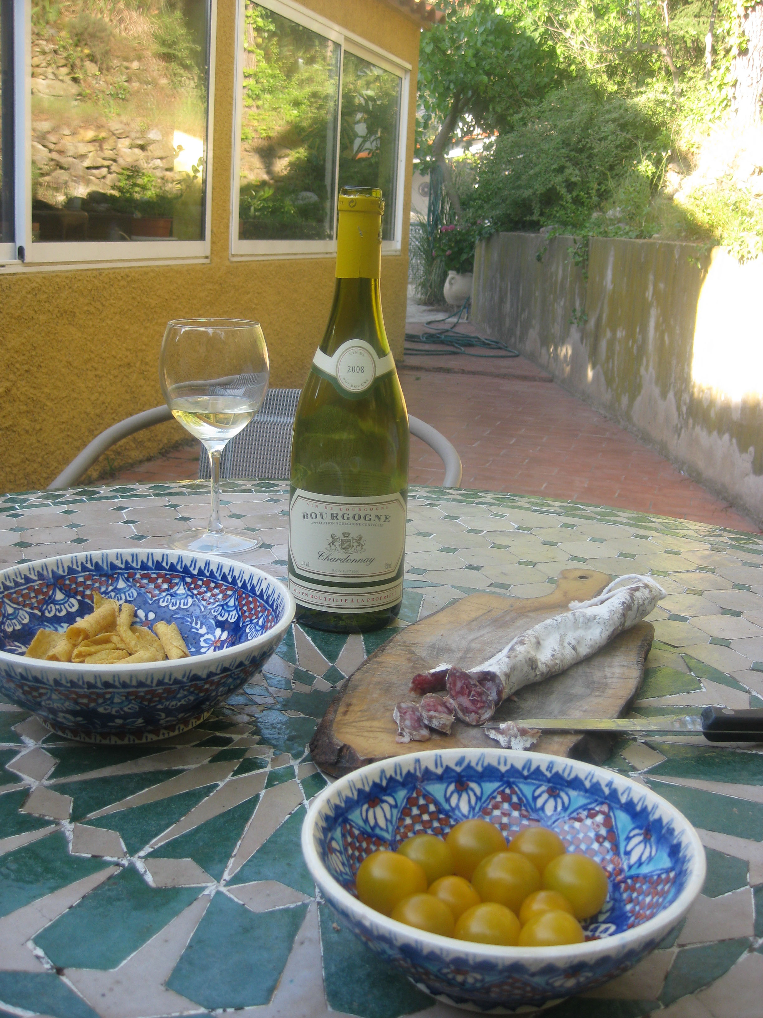She drove us to her charming house, where we sat in her garden. She opened a bottle of wine and brought out some nibbles: A Spanish cured sausage (Martine lives a stone’s through from Espagne), some corn chips that were a little like Fritos, and a bowl of fresh, local cherry tomatoes.