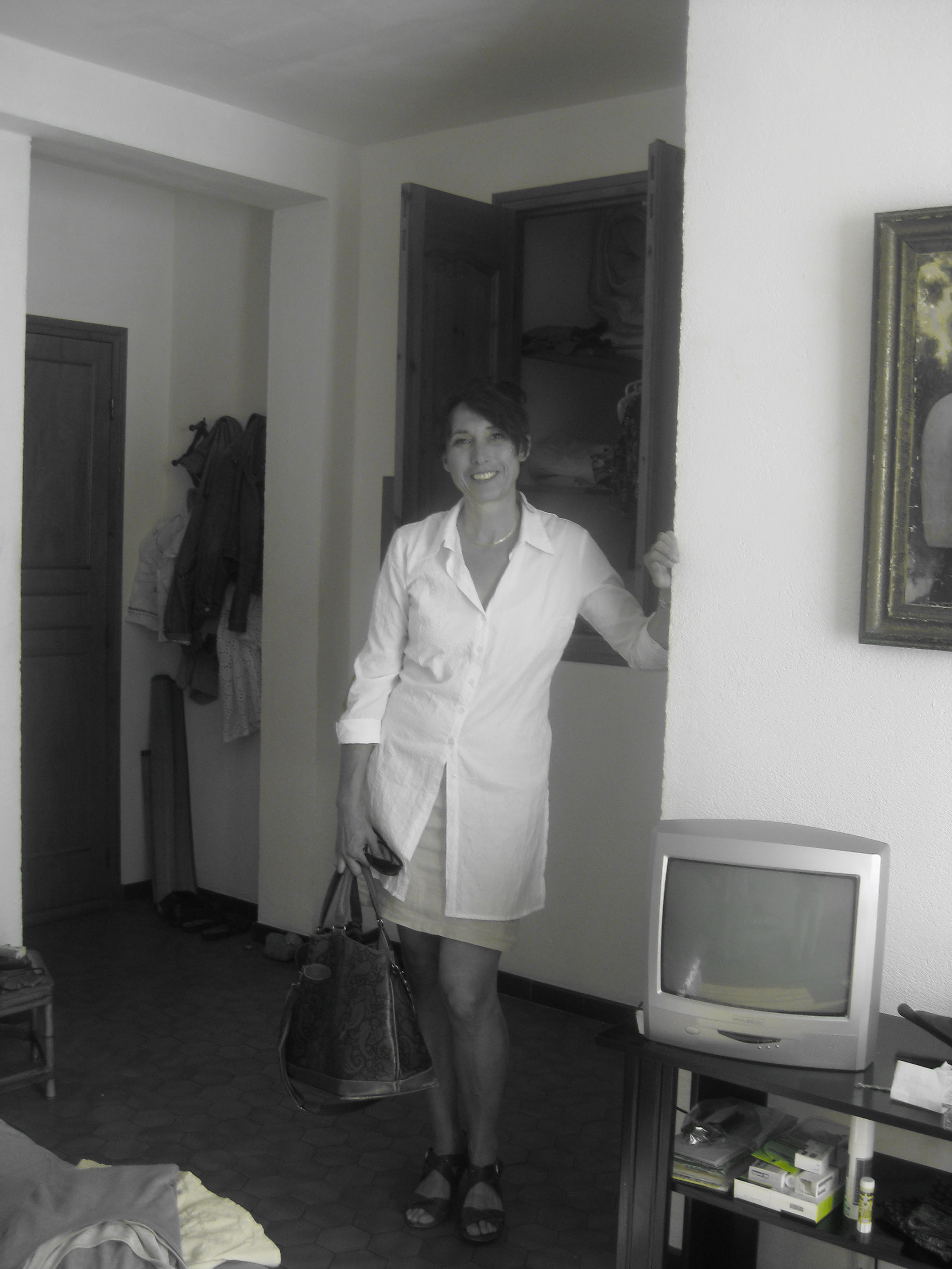 As we didn’t have a car, she came to pick us up (she lived in a village about 10 miles away). At left is a photo of her after a day of work. Très chic, n’est-ce-pas?