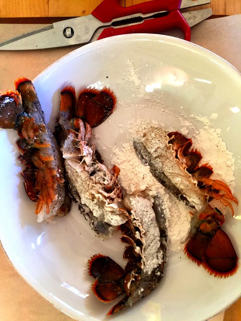 - Place the flour in a shallow bowl. Dredge the meat sides of the lobster tails in the flour lightly (do not coat the shell side); shake off excess flour.