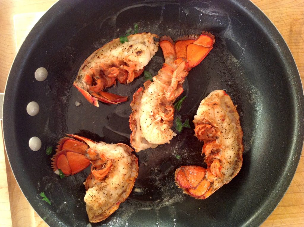 - Melt 1½ tablespoons of the butter in a skillet over medium-high heat until hot. Add the lobster tails, meat side down, and cook, shifting around in the pan a bit, until the lobster meat is very lightly brown.