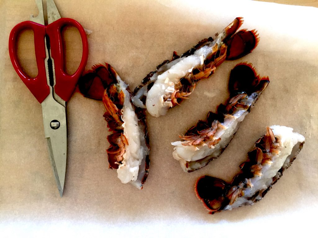 1. Cut the lobster tails in half. Using kitchen shears, cut lengthwise through the top shell, the meat, and the bottom shell—all the way through. Season to taste with salt and pepper.