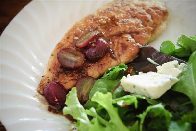 P.S.: You know how well grapes and blue cheese go together? Serve this with a lightly dressed green salad topped with a bit of blue cheeses, as pictured above. C’est super!