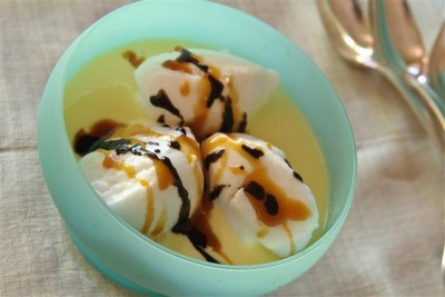 To serve, if needed, gently warm the sauces to drizzling consistency. Spoon about 2 tablespoons chocolate sauce in each of 4 serving bowls. Divide chilled Crème Anglaise evenly among bowls. Top each with 3 poached meringues. Drizzle with caramel sauce and a little bit more chocolate sauce.