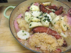 And yes, I have a Choucroute Garnie recipe in my book. Well, actually, two: One is quick braise that can be done in an hour, making it a great choice for Tuesday night. The other takes a little longer to braise, because it includes some salt pork belly, but it’s hands-off simmering time and not difficult at all. It’s a great choice for a weekend meal.